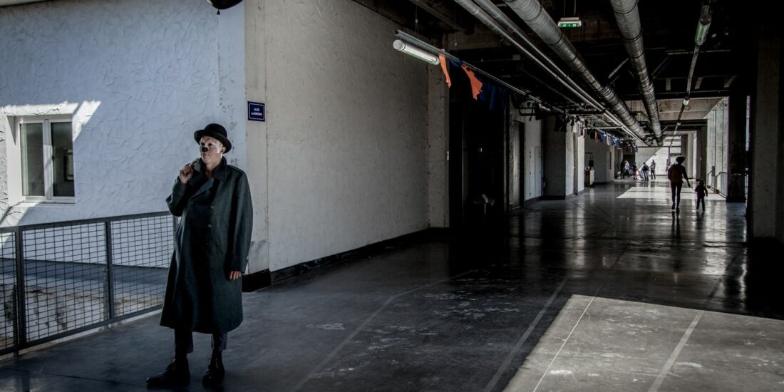 Une scène comme une zone à défendre, comme un décalage entre notre théâtre de rue joyeux et l’impression persistante que le monde agresse—ou s’effondre—tout autour. Frigo ne lutte pas. Il tient debout. Attaqué, bombardé, il est armé sans raison précise, sauf celle, urgente, de l’être. À ses côtés, une voix. Elle chante, parle, souffle, mix. Elle est présence sonore et poétique, mémoire et contrepoint. Une clown blanc au micro, qui met en scène son auguste au nez noir.